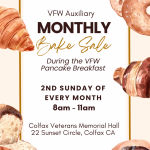- 8VFW Post 2003 Pancake Breakfast8:00 am - 11:00 amVeterans of Foreign Wars, Jess E. Taylor Post 2003 will serve pancakes, sausage, eggs, ham, and more! Proceeds go to support local veterans, current service members and their families. 8am-11am. Colfax Veterans Memorial Hall, 22 Sunset Circle. colfaxveterans.org/vfw. , ...VFW Auxiliary Monthly Bake Sale8:00 am - 11:00 am
